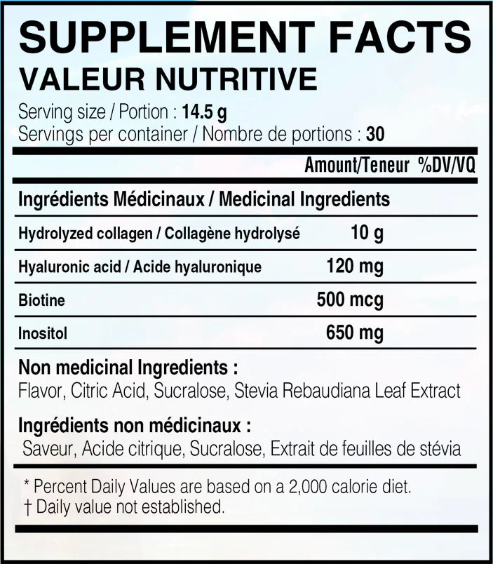 Marine Collagen + est un collagène marin de haute qualité, avec de la biotine, de l'acide hyaluronique et de l' inositol. Le collagène marin aide à soutenir la santé des articulations et à réduire la douleur. Les autres ingrédients médicinaux contribuent à la santé de la peau, des cheveux et des ongles ! Disponible en 2 délicieuses saveurs fruitées et aussi non aromatisé pour mélanger à votre café frais du matin.
