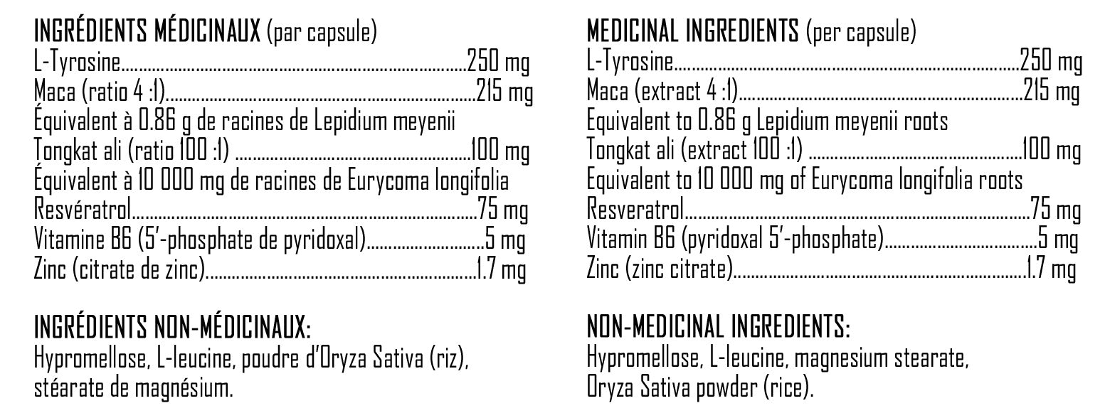 Le maca, pour sa part, était un choix logique, car son rôle sur la santé du système hormonal n’est plus à faire. La tyrosine et la B6 viennent compléter le mélange et permettent un meilleur équilibre des neurotransmetteurs (comme la dopamine et la sérotonine).