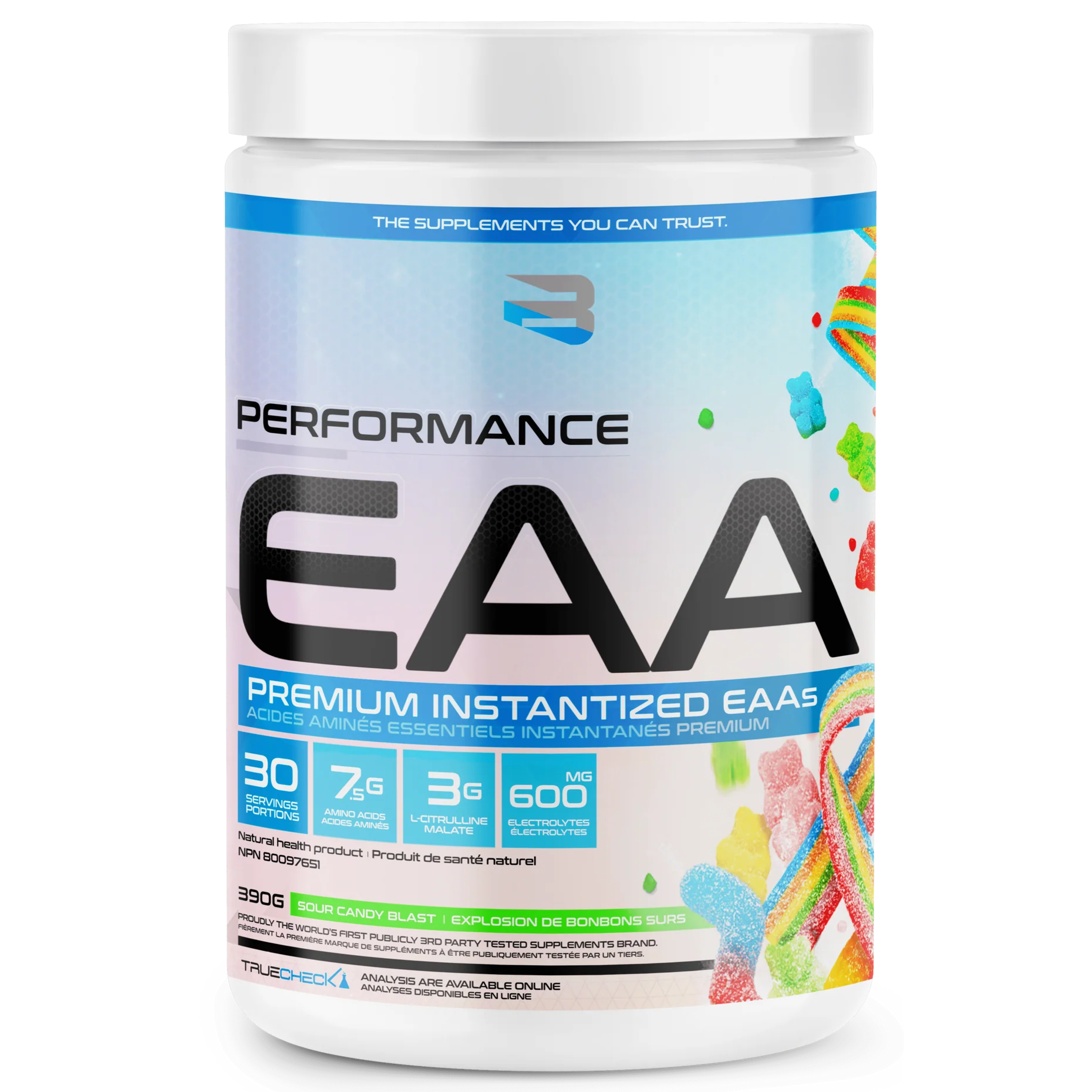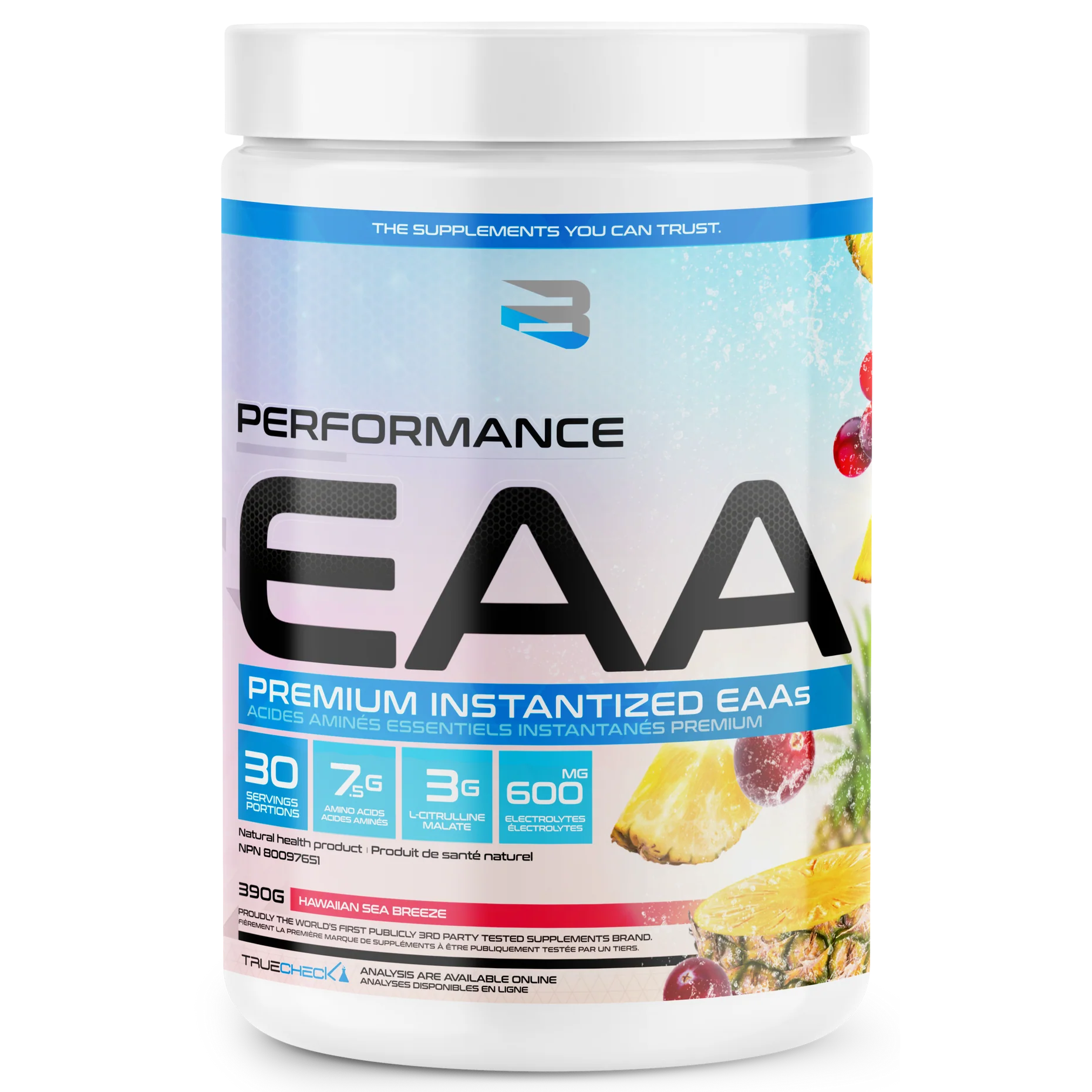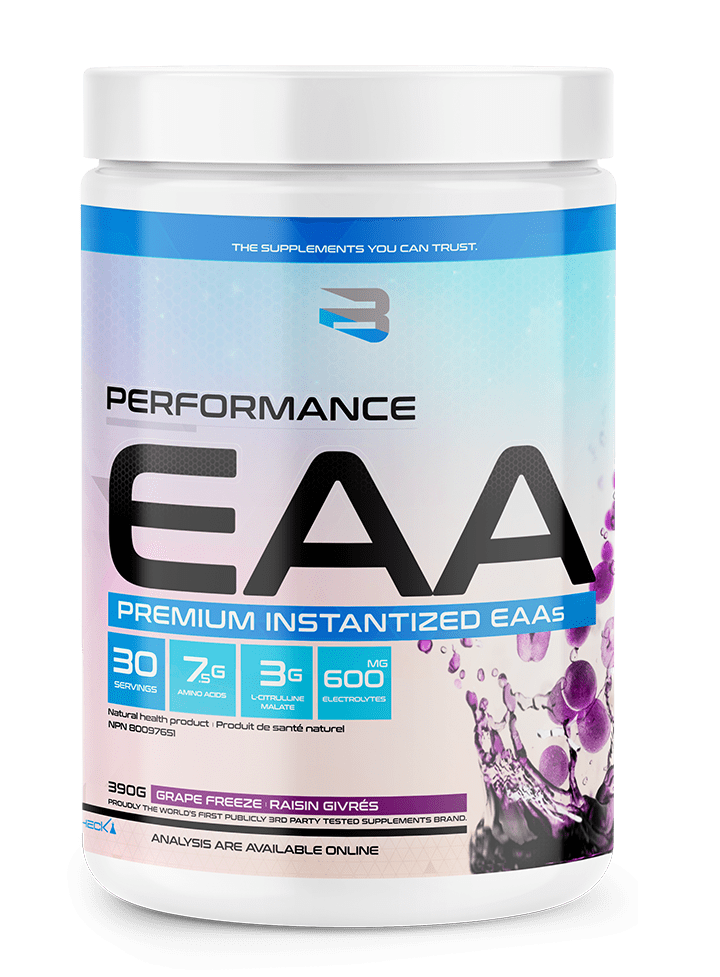 Les acides aminés essentiels ne peuvent pas être produits dans le corps et doivent être consommés. Les EAA sont composés de 9 acides aminés essentiels, dont les acides aminés à chaîne ramifiée (leucine, isoleucine, valine) et les 6 autres EAA (histidine, lysine, méthionine, phénylalanine, thréonine, tryptophane). Les acides aminés sont les éléments constitutifs des protéines. C’est pourquoi les EAA sont la clé de la synthèse des protéines pour construire le tissu musculaire!