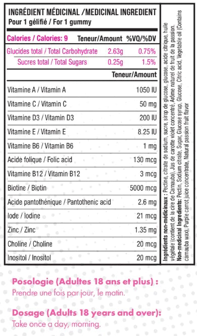REMPLI DE VITAMINES ET DE MINÉRAUX : Nos jujubes contiennent 5000mcg de Biotine et sont infusées de vitamines telles que la vitamine C, vitamine D3, vitamine B6 et vitamine B12. Ils contiennent également 130mcg d'acide folique qui contribue à l'entretien des cellules.