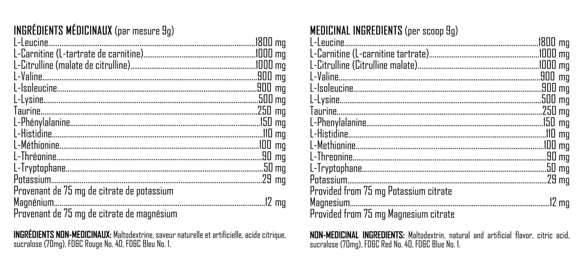 Nous avons ajouté à ce mélange exclusif de la L-Carnitine tartrate, de la citrulline malate et de la taurine afin d’augmenter la capacité d’entraînement, optimiser la récupération et maximiser la fonction musculaire.